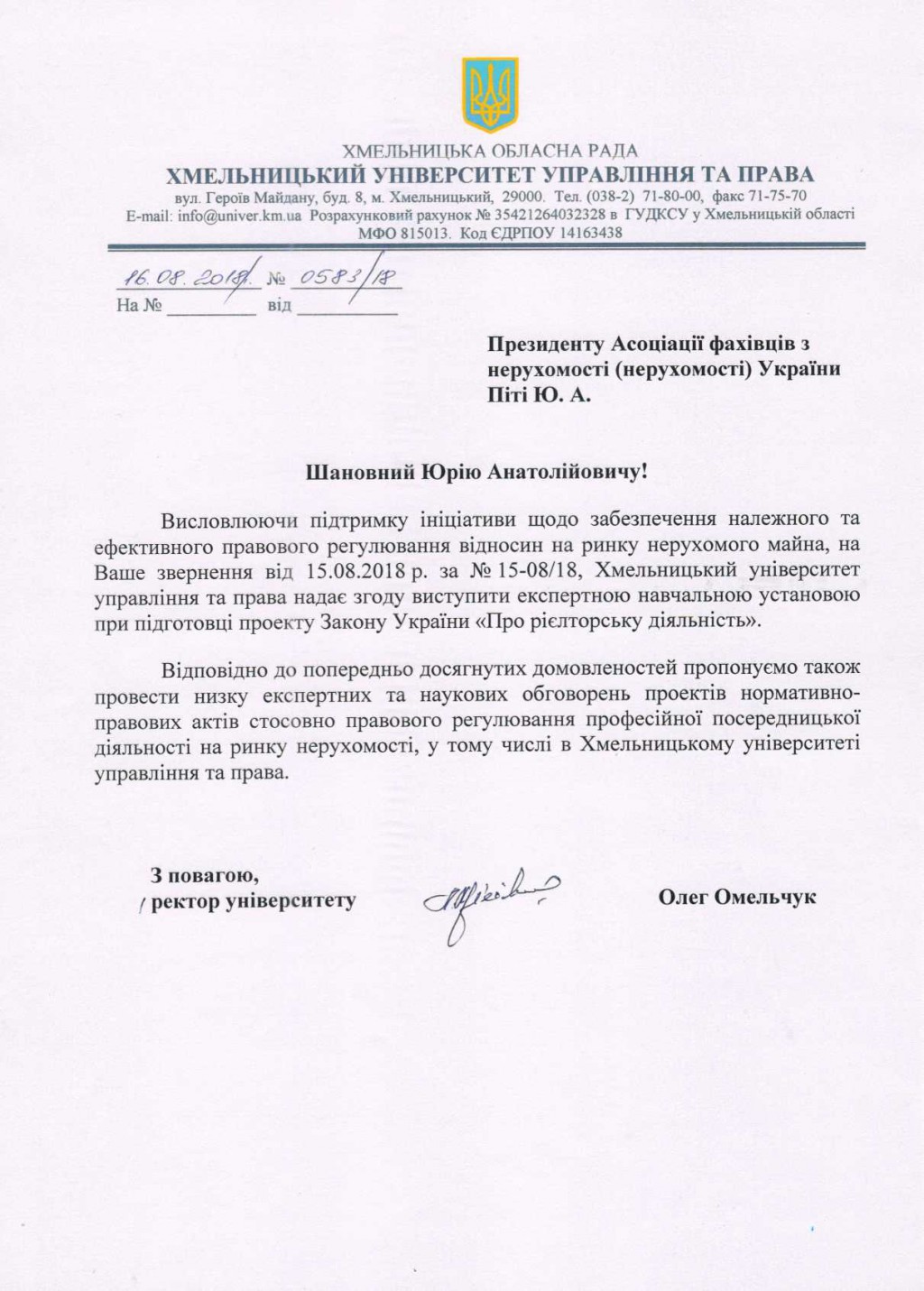 В рамках работы над проектом закона «О риэлторской деятельности» Ассоциация специалистов по недвижимости (риэлторов) Украины пригласила к сотрудничеству высшее учебное заведение - Хмельницкий университет управления и права. Университет является партнером организации не первый год, и мы уверены, что авторитетное мнение экспертов Университета принесет неоценимую пользу в нормотворческой работе участников рабочей группы.
