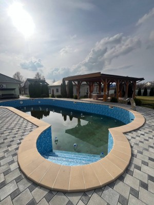 басейн 17 кв.м, оздоблений керамічною плиткою, відбувається постійна фільтрація та заміна води завдяки насосу.