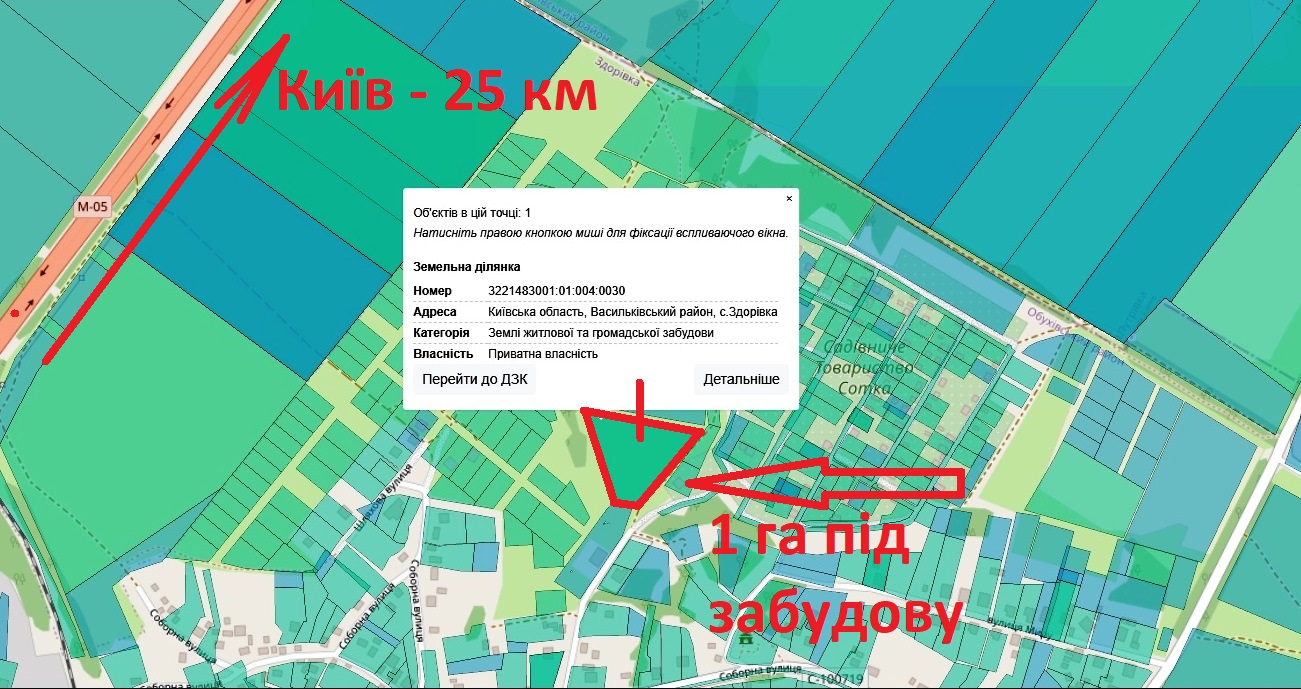 Продаж земельної ділянки 1 га (100 соток) в с. Здоровка, Васильківський р-н, Київська обл. Цільове призначення – для будівництва та обслуговування житлового будинку. Ділянка рівна, на невеликій височині зі зручним заїздом по асфальтованій дорозі. Всього 25 км (або 25 хвилин автомобілем) до метро Теремки. Знаходиться приблизно в 1 кілометрі від Одеської траси. Поруч є кінцева зупинка автобуса.