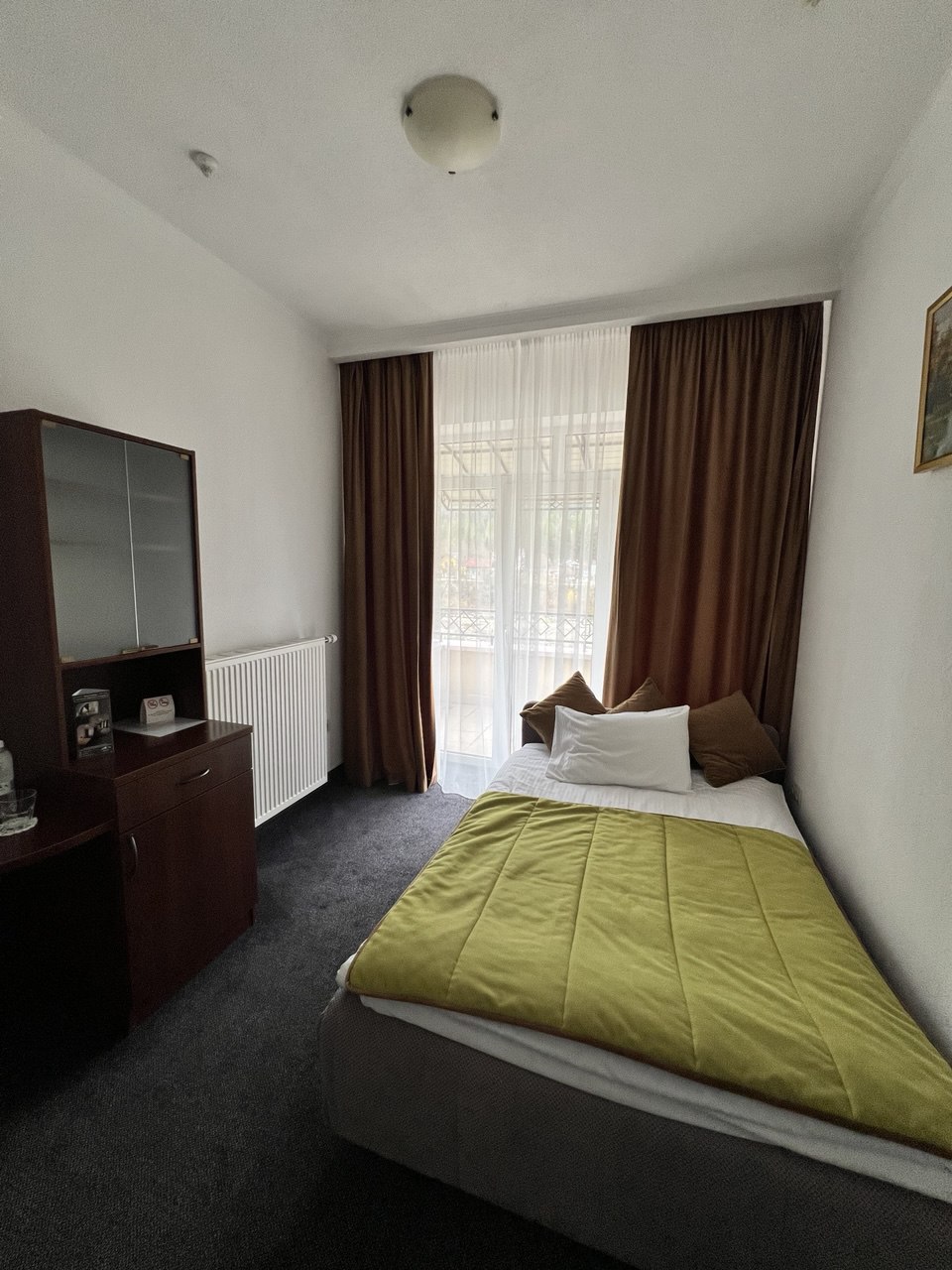 Пропонуємо готельний номер загальною площею 30,6 кв.м на третьому поверсі з виглядом на гори та річку Прут. Дві кімнати, одне односпальне та одне двоспальне ліжко, санвузол.