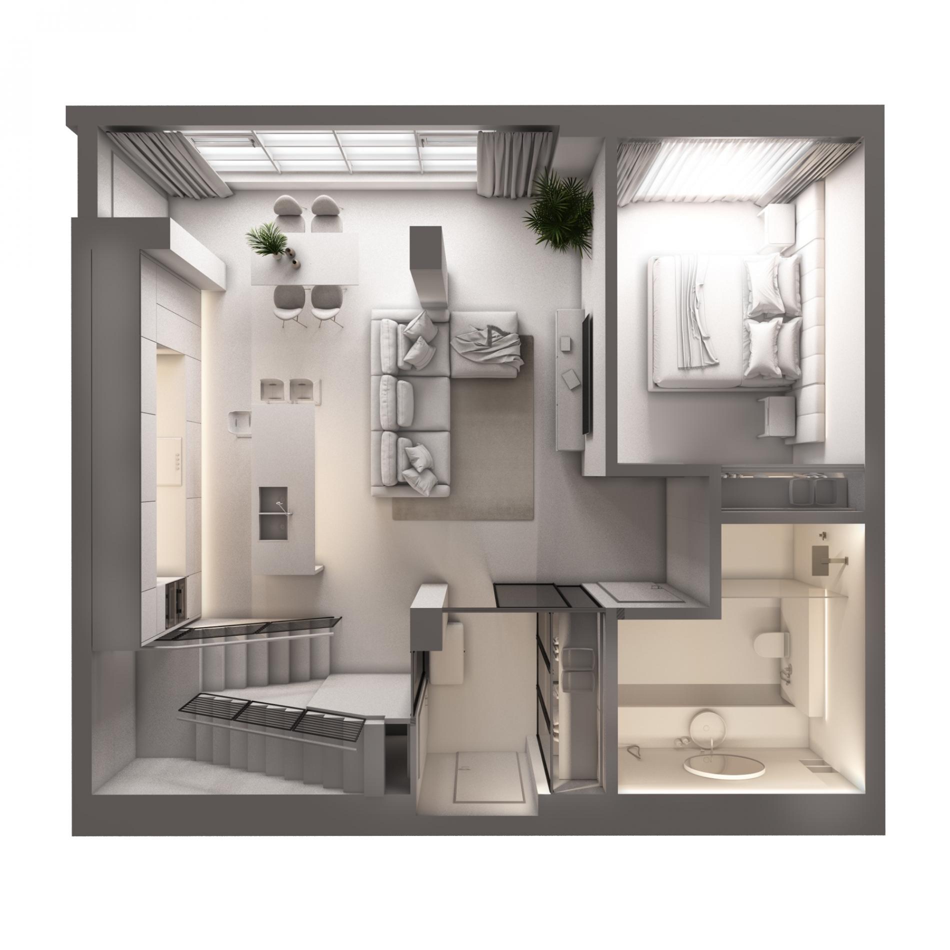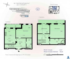 1-й рівень (19-й поверх): кухня-студія – 20,85 кв.м, спальня 22,48 кв.м, санвузол 6,56 кв.м, передпокій – 16,66 кв.м, лоджія – 6 , 73 кв.м.