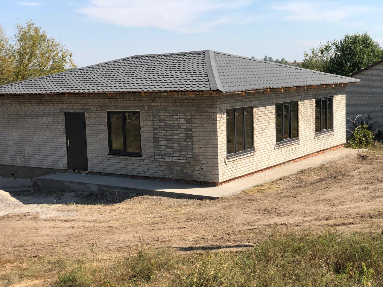 Будинок: - Цегляний, одноповерховий. - Загальна площа 118 м2. - Розмір 11.2 м x 10.5 м. - Раціональне планування. - Без оздоблення. - Дах - металочерепиця. - Вікна металопластикові. - Зроблено вимощення.